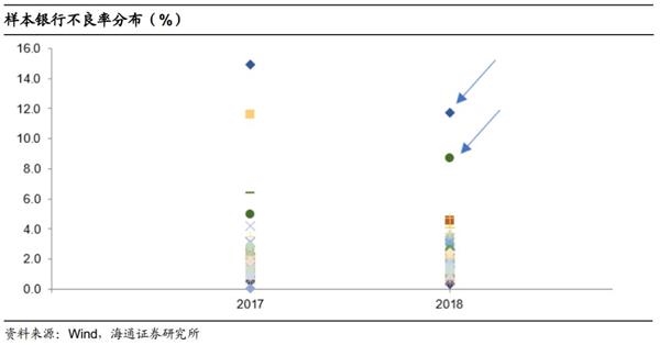 从不良率来看,样本中小银行基本平稳,呈现分化。我们整理的发债中小银行样本中,有103家公布了2017年和2018年的不良率数据。从样本看,2018年底平均不良率较2017年底基本持平,平均大约在1.96%附近,但个体差别比较明显,个别银行不良率在2018年底仍超过10%,也有一些银行的不良率在2018年大幅增加超过2个百分点。