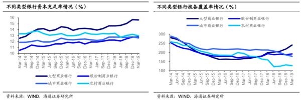 城商行拨备覆盖率略有下行,农商行下行较快;城商行及大型商业银行以及股份制银行资本充足率处于14年来较高水平。农商行拨备覆盖率在17年3月至18年6月之间有较为显著的下降,随后稳定在125%左右,城商行略有下降。从资本充足率来看,城商行资本充足率呈现稳定上升趋势,农商行资本充足率波动中略有下降。