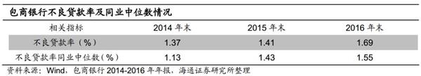 从包商银行资产质量来看,贷款质量不佳,不良贷款率逐年升高。截至2014年-2016年末,包商银行不良贷款余额分别为13.01亿元、17.16亿元、以及26.41亿元;关注类贷款余额分别为27.92亿元、29.62亿元以及45.41亿元;不良贷款率分别为1.37%、1.41%以及1.69%。从同业平均水平来看,15年略低于同业不良贷款率中位数,但14年及16年均显著高于平均水平。