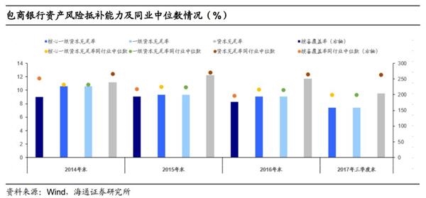 由于包商银行未公布最新的财务数据相关情况,最近的一期数据为2017年三季报。同业平均水平数据我们选取各时间点发行同业存单的城商行公布的相关指标情况,对于资产质量、风险抵补能力以及流动性水平指标,简单选取中位数作为参考基准。