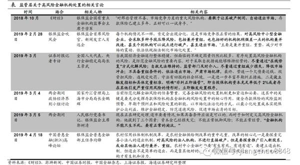 事实上,今年以来监管对于高风险金融机构处置越发重视,在不同场合多次提出要处置高风险金融机构。银保监会新闻发言人肖远启在银保监会吹风会上提出,“对高风险中小型金融企业,会采取多种手段压降风险,包括兼并重组,也包括好的机构把稍微差一点的机构兼并改造,甚至个别机构可以试点进行破产,甚至退出市场”;央行金融稳定局局长王景武在接受媒体采访时指出“尽量通过”在线修复“方式化解风险;自救无法维持的,监管部门及时介入,尽量通过重组减少损失,降低市场冲击”,“设立触发指标和具体定量标准,明确”非纠正即接管“。即当投保机构资本充足率低于2%或者存在其他引发严重信用风险的情形时,立即触发处置程序。”银保监会主席郭树清在两会期间提出,“对高风险的法人机构,不进行直接破产,但是要探索推广引入东,或由其他法人进行兼并、重组”。