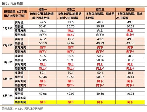 总体而言,由于5月发电耗煤同比下降幅度较大(按月末同比-18.62%,按截止25日同比-16.40%),且四个模型都预测PMI向下。我们判断5月PMI数据将较4月份进一步回落,且很有可能回到荣枯线下方。市场对短周期企稳的预期将得到修正。
