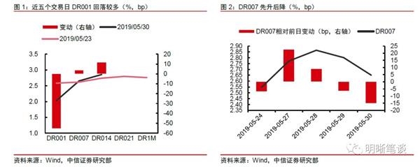 上周五(5月24日)至本周四(5月30日),央行连续开展公开市场操作,净投放5100亿元,用以平复包商银行事件带来的银行间流动性短缺态势,资金面大体呈现先紧后松的状态。总体而言,近五个交易日DR001下行55.24bp,DR007小幅收涨3.67bp。