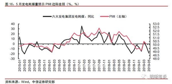 即将公布的重要经济数据有PMI和,5月PMI走弱概率较大。本周五将公布中国5月制造业和非制造业PMI,下周五将公布中国5月外汇储备。观察2015年至今的发电耗煤同比数据和PMI的关系可以发现,发电耗煤同比变动与PMI走势大体相符。发电耗煤同比正增的月份,PMI大概率位于荣枯线以上;而发电耗煤同比下滑的月份,PMI大概率位于荣枯线以下。5月发电耗煤同比下滑约18.75%,这意味着PMI下滑至荣枯线以下的概率较大,届时货币政策边际放松的预期或将升温。