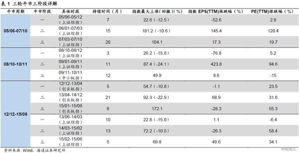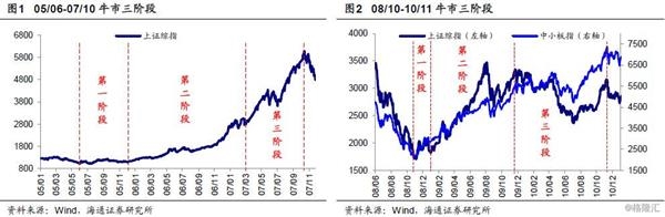 牛市的三个阶段在05、08年两次牛市中均有印证:①05/06-07/10牛市的三个阶段依次为05/06-05/12、06/01-07/03与07/03-07/10,其中第一阶段全部A股累计同比增速从05Q2的4.1%下滑至05Q4的-5.8%,而上证综指PE(TTM)上涨2.9%,期间指数最大涨幅22.6%;第二阶段全部A股净利润累计同比增速从06Q1低点-14.4%触底回升至07Q1的80.7%,上证综指PE(TTM)上涨120.4%,戴维斯双击带动指数最大上涨181.2%;第三阶段基本面增速已经放缓,全部A股净利润累计同比增速从07Q1的80.7%回落至07Q3的64.0%,但估值却继续上行,上证综指PE(TTM)上涨19.7%,指数涨幅104.1%。