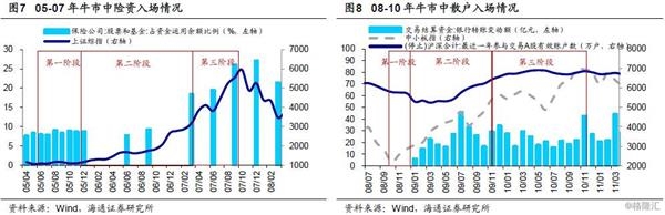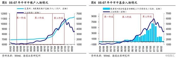 ① 05/06-07/10牛市中资金在第一阶段并未大量入场:这轮牛市的第一阶段位于05/06-05/12,期间我们可以跟踪到散户、公募和的资金入场情况。散户由于数据较为久远只能看沪深交易所公布的月度期末A股账户总数这一指标,05/06牛市第一阶段刚启动时账户总数为6950万户,05/12第一阶段末期账户数为7000万户,仅变动50万户,增幅不到1%,散户并未入场。公募基金方面我们用与的份额来衡量基金的规模状况,05/06-05/12两大基金的份额从2590亿份上升到2610亿份,变动20亿份,增幅也不到1%。方面, 05/06-05/12险资运用余额中股票和基金的占比从7.8%上升到8.8%,变动幅度也不大。