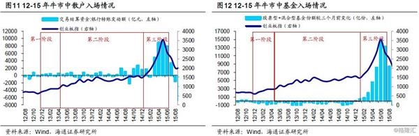 牛市第二、三阶段:场外资金于第二阶段中后期开始跑步入场。牛市第一阶段从资金面上看主要是存量资金开始活跃,增量资金尚在观望。那增量资金何时入市?回顾历史,我们发现场外资金往往在牛市第二阶段中后期才开始入场,并在第三阶段大幅流入,推动牛市走向泡沫化: