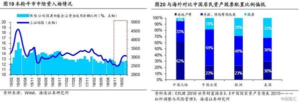 ② 未来潜在入市资金二:以保险类资金与资金为代表的长线内资。除了外资,本轮牛市另一大资金来源有望来源于国内居民。根据《凯捷2018世界财富报告》与《中国国家资产负债表2015———杠杆调整与风险管理》中数据,2015年我国居民资产中占比高达62%,现金、存款与保险等固收类产品占比为33%,股票配置比例仅为5%,而2017年美国分别为30%、38%、32%。截至2016年我国城镇居民人均住房面积约36.6平方米,相比于2000年的20平方米已经大幅提高,2018年我国人口年龄均值为37.4岁,将跨过25-40岁买房高峰期。2019年2月22日中央政治局明确指出要深化金融供给侧结构性改革。