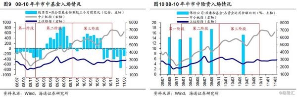 ② 08/10-10/11牛市中资金在第一阶段小幅流出:这轮牛市的第一阶段位于08/10-08/12,期间我们可以跟踪到散户、公募基金和的资金入场情况。散户方面,由于前述的账户总数指标无法剔除不活跃账户的影响,因此我们改用中证登公布的“最近一年参与交易A股有效账户数”,简称A股活跃账户数,该指标在第一阶段从5780万户小幅下降到5750万户,表明散户并没有大幅入场。基金与保险方面,股票型与基金份额从19400亿份小幅下降到19030亿份,险资运用余额中股票和基金的占比从14.2%小幅下降到13.3%,两者也未入场,因此08年牛市第一阶段中场外资金并未进场。