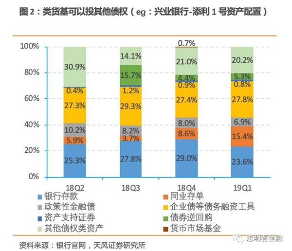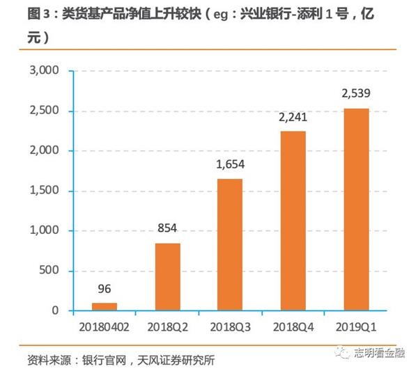 2)投资期限,货基投资的存款/央票/存单需在1年以内,债券/债务融资工具/ABS需在397天内,而类货基目前暂无要求;3)杠杆率,货基是120%,类货基则可达140%;4)估值方法,尽管央行720《通知》明确类货基可以参照公募货基“摊余成本+影子定价”估值,但未正式明确偏离度的控制要求。类货基规模上升很快。以-添利1号为例。产品18年4月成立时规模仅96亿,到19年1季末产品净值已达2539亿。