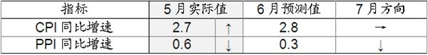 预计6月CPI同比增速进一步抬升0.1个百分点至2.8%,将达到年中高点;PPI同比增速预计将进一步下降0.3个百分点至0.3%,目前来看仍未触底。预计食品环比变动0%较上月回落,其中鲜果与猪肉项将是主要支撑,鲜果价格环比涨幅有所回落但仍居食品中的首位,而猪肉价格6月以来抬升较为明显,环比涨幅将由负转正;鲜菜与蛋类价格则是6月环比跌幅靠前的类别。非食品方面,国际油价6月整体相较5月份下降较为明显,国内总需求的疲弱也不利于非食品价格走高,预计非食品环比持平上月的0%。整体来看,预计CPI环比为0%持平上月。预计6月PPI环比为0%,PPI同比进一步下降至0.3%。