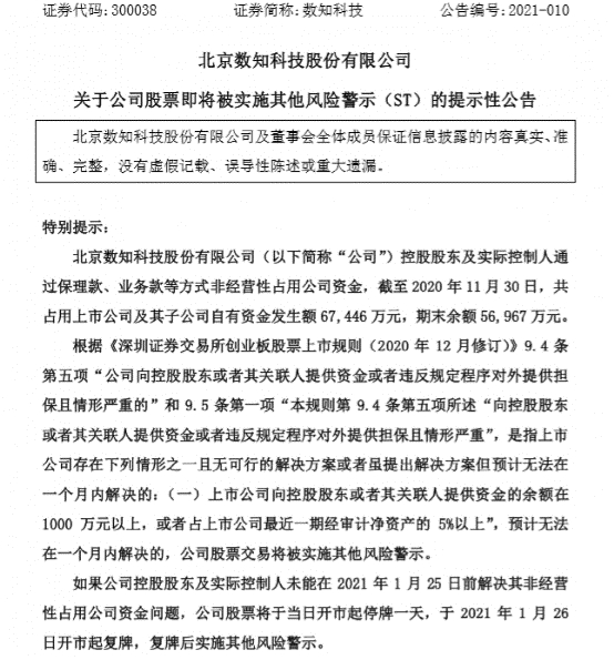 1月18日晚间,数知科技公告称,公司控股股东及实际控制人通过款、业务款等方式非经营性占用公司资金,截至2020年11月30日,共占用上市公司及其子公司自有资金发生额67,446万元,期末余额56,967万元。如果公司控股股东及实际控制人未能在2021年1月25日前解决其非经营性占用公司资金问题,公司股票将于当日开市起停牌一天,于2021年1月26日开市起复牌,复牌后实施其他风险警示(ST)。