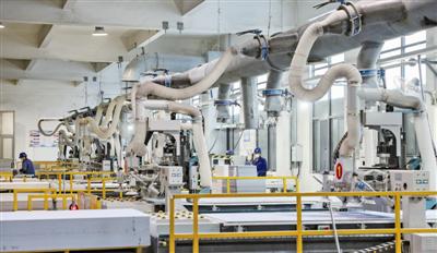 在宇航板业精加工车间,多台自动化雕刻机正开足马力赶制订单。硅藻泥原料板经过上板、雕花、切割、推板等工序后,最终成型为一块块速干地垫。“这批定制化雕刻机由我们和厂商共同开发,一台机器就是一条生产线,不仅仅节省了人工,而且提高了工作效率,产能比以前提高了50%以上。”宇航板业副总经理毛留益介绍。