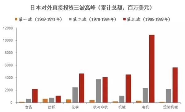 日本国内制造业为了寻求低工资,向亚洲加速转移。制造业生产大规模外移,严重打击了私人部门对国内投资的热情,导致日本国内出现了产业空心化。并且,从1969-1989年间,日本三次对外投资高潮期来观察,重点领域也发生了变化,第一阶段转移的劳动密集型的纺织行业,第二阶段是化学、钢铁产业,第三阶段作为技术密集型的机械、电机等行业也出现了大规模转移。