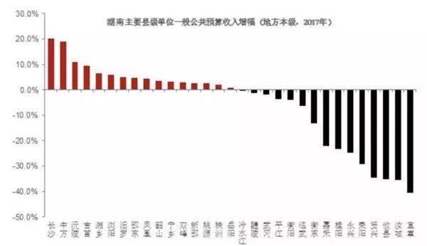 再下一层的地方政府或许还饿着肚子。例如前期发生的湖南耒阳拖欠公务员工资事件,也反映出地方财政已经面临极为严峻的压力。通过梳理湖南省内30个重点县级单位,发现包括耒阳在内,接近一半的县级单位,2017年的财政收入负增长,范围较2016年大幅扩大。本来就已经是“吃饭财政”的地方政府,如何还能拿出钱来支持新旧动能转换呢?