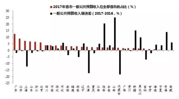 但如今地方财政状况面临压力,也可能传导至动能转换。通过对比全国31个省市2017年和2016年一般公共预算收入的数据就可以发现,传统收入大户均在降速,例如广东、江苏、上海、山东、浙江、北京2017年一般公共预算收入增速要么持平要么下降,尤其是上海2017年的增速较2016年大幅回落了近7个百分点,这或与上海高度服务化的产业结构相关。
