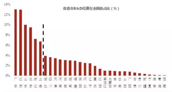 而这些传统大户也是新旧动能转换的核心区域,根据国家统计局公布的《全国科技经费投入统计公报》,只有上述六个省市的R&D经费在全国占比超过6%,这六个省市R&D经费加总后接近全国的60%,面对收入降速的局面,或许会传导到动能转换上。