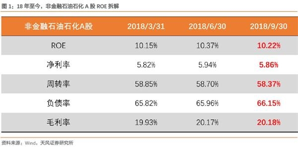 从数据上来看,18Q3非金融石油石化A股的TTM毛利率为20.18%,较Q2的20.17%,几乎已经无法再继续提升。同时也无法再对冲持续上升的销售费用和财务费用,因此18Q3的净利率出现了明显的回落,也导致ROE结束了连续8个季度的抬升。