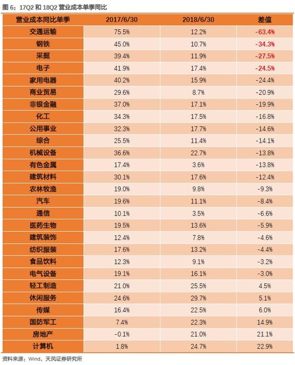如果更进一步将毛利率拆分为和营业成本, 从收入的角度来说,非金融A股的单季度营收增速从17Q4开始,已经出现了比较明显的下台阶,17Q3、17Q4、18Q1、18Q2分别为23.18%、12.54%、13.95%、14.62%。但是反观成本端,下滑的速度更加显著,17Q3、17Q4、18Q1、18Q2分别为22.82%、11.32%、13.00%、13.09%。