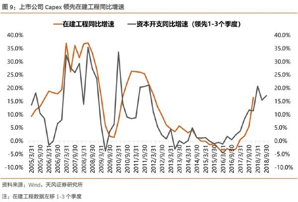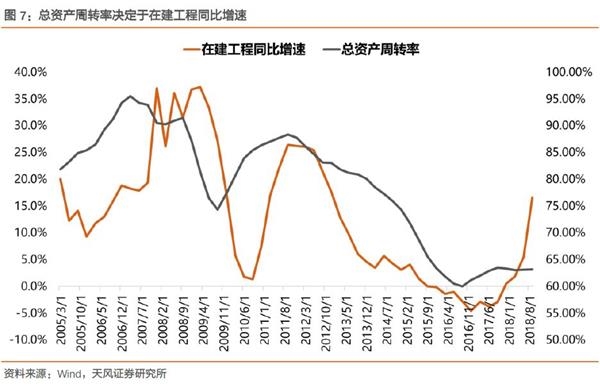 因此,当我们在过去一年看到非金融A股的资本开支已经逐步起来的时候,就已经开始做出了“在建工程”或者说“总资产周转率”要开始抬升的判断,而18年中报和三季报的数据,也再次验证了这样一个领先指标的有效影响,“在建工程”开始从底部逐渐起来,尤其是三季度,比我们想象的上升速度更快。