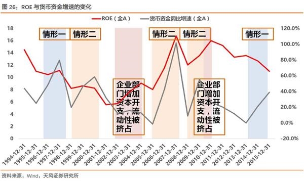 一是ROE上行,企业部门赚了很多钱,但又不用于资本开支,比如下图中的情形一,但是如果企业部门ROE上行,但是开始大量增加资本开支的时候,货币资金增速同样也是下行的,比如03-04年和10年,对应的也是熊市。