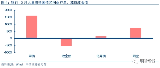 10月的托管数据显示了近期地方政府债放量发行步伐放慢,叠加政策释放的积极信号,银行对短融、超短融和企业债的持有有所增加。总体来看,银行在10月份对国债和同业存单进行了大量增持,而对信用债的增持减少,并且大量抛售政金债,反映银行在稳健中性货币政策下风险偏好减弱,未来随着政策的正式执行市场的整体风险偏好将有所上升。