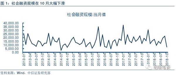 今年以来社融增速不断下滑,央行虽在7月和9月两次调整社融口径,整体来看,社融口径调整虽然立竿见影地改变了社融增速的数值,但是变其下滑的走势并未随之改变,10月社融同比增速降至10.2%,创有数据以来的新低。从增量上来看,社会融资规模也开始出现大幅下滑,从1月的30673亿元下降连续下降,虽然在9月有小幅反弹,但是10月急转直下,只有7288亿元,创下了16年以来的新低。由于民营企业占经济体量大,但是融资渠道匮乏,融资成本高企,债券违约潮的爆发,今年以来,从银行资产端来看,银行贷款总额中只有25%流向了民营企业,导致经济长期增长缺乏动力。