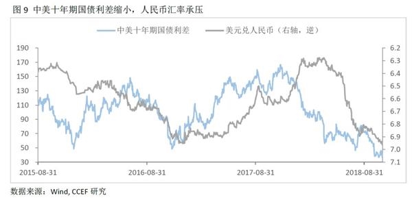 2017年至2018年间,美国加息节奏逐渐加快,中美十年期国债收益率利差进入下行通道,截至10月底,中美十年期国债利差跌至36BP。美国目前仍然处于加息周期,而中国货币政策将维持中性,中美金融周期的错位,使人民币汇率将继续承压。