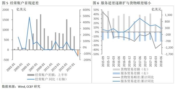 此外,经常项目的逆差扩大。2018年上半年,我国经常账户首次出现约280亿美元的逆差,从细分项来看,服务逆差扩大的同时,货物贸易顺差在不断缩小,导致经常账户总帐出现逆差。经常账户逆差和资本市场(股票、债券市场)资金流入使得外汇储备虽然总额保持稳定,但结构出现一定变化,资本市场的热钱具有快来快去的特点,资金稳定性很弱,这就使得外汇储备总量的不确定性增加,支撑人民币汇率的作用减弱。