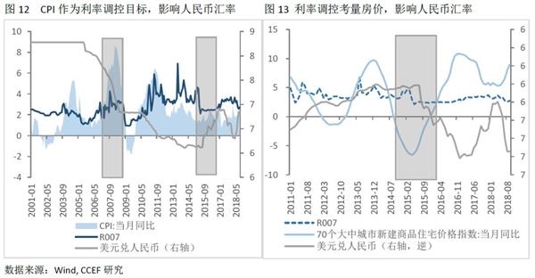 中美市场利差的变化会直接影响金融资本的跨境流向及人民币汇率,而央行调整必须考虑经济增长态势、通胀及房地产调控。2007年初至2009年初通胀突破3%,大幅上涨,为“防通胀、防过热”央行先后多次加息,而金融危机后美国长期处于量化宽松,人民币汇率升值。自2013年以来,国内长期稳定在2%以下,央行对利率的调控更多考量房价,2014-2015年刺激房地产市场,央行连续5次降准降息,人民币进入贬值通道。