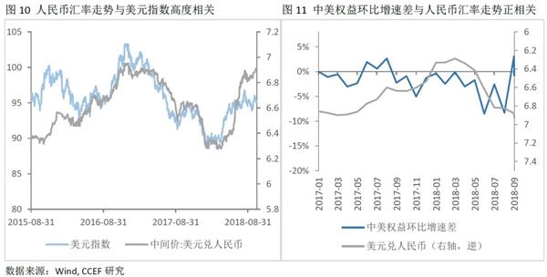 2015年“811”汇改之后,人民币汇率中间价的形成机制(即收盘价+一篮子货币汇率+逆周期因子)决定了人民币汇率短期受外汇市场供求和美元指数变化的影响。中美权益市场环比增速差引起的资本跨境流动也在一定程度上影响了短期货币供求和汇率波动。2018年1-9月份,中美权益市场环比增速差基本为负数,即中国权益市场的涨幅基本跑输美国,与之相对于,人民币对美元的汇率也一路下行。(图11)