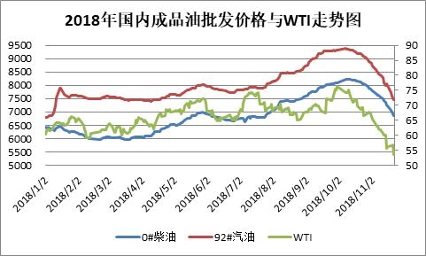 国际原油价格震荡起伏,直接影响到我国成品油市场价格变化。在零售方面,我国零售价在2018年至今共经历23次调价:9次下调,13次上调,1次搁浅。涨跌抵消后,我国零售价较去年末上涨545元/吨。而最新一轮变化率仍以负向加深运行,据金联创测算,截至11月22日,参考原油品种均价为62.73美元/桶,变化率-6.73%,对应汽价格下调300元/吨,且仍有不断拓宽之势。故预计11月30日零售价兑现“三连跌”之后,我国零售价或基本回到年初水平。