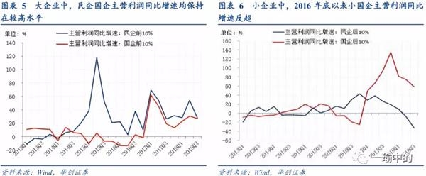 小企业则呈现明显的“国进民退”现象。民企和国企的主营业务利润同比增速也出现分化,2016年底开始,尾部国企表现改善反超尾部民企,民企后10%的企业主营利润增速持续下降,2018年陷入负增长。