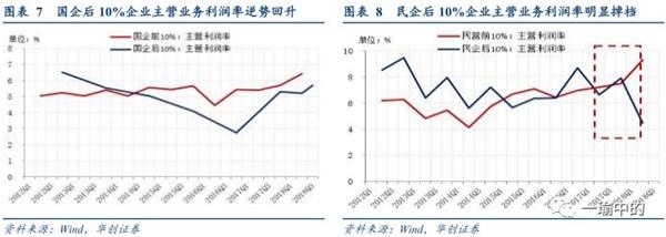 国有企业中,内部差距缩小,特别是尾部企业追赶加速。2016年下半年开始,后10%国企持续下降的利润率扭转回升。民营企业中,内部分化,头尾差距在2018年凸显,后10%的民企主营业务利润率2018年下半年来明显掉档。