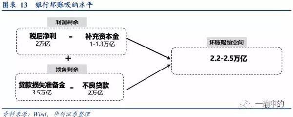 截至二季度末,我国商业银行贷款105万亿元,不良贷款2.0万亿元,贷款损失准备金3.5万亿元左右,每年税后净利2万亿元。假设银行税后利润的1/2-2/3用于补充资本金,那么在不影响银行资本金考核、银行稳健经营、不考虑政府注资扶持的条件下,预计金融机构极限吸纳坏账幅度在2.2-2.5万亿元(对应不良率的上限是4%-4.3%)。银企共同体考验的是银行的坏账吸纳水平,银行体系是面对经济下行与坏账的第一吸纳屏障,这道屏障目前的吸纳力还有2.2-2.5万亿元的空间。