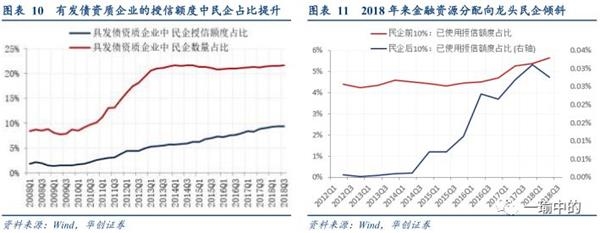 这个比例在过去很多年一直比较稳定,且民营企业的融资占比是提升的。但民营企业内部,2018年来金融资源分配开始分化,向龙头民企倾斜,是尾部民企年初以来经营受困的金融表现。