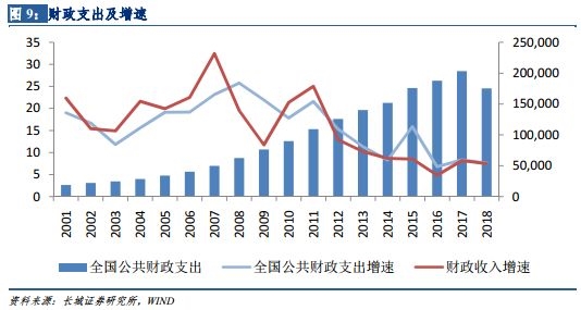 但从19年整体情况来看,减税加码力度可能不及市场预期,预计19年加码减税的力度为8000亿元。主要是由于:3%的赤字率水平不会轻易突破;前期增值税减税效果还有待时间验证,且减税并档应是一个循序渐进的过程;财政收支步入低增速运行阶段,未来大概率会稳定在5%的增速水平,而政府财政支出相对刚性,减支空间有限;新税种的实施具有很大的不确定性。