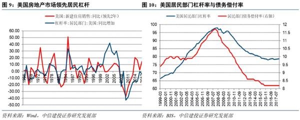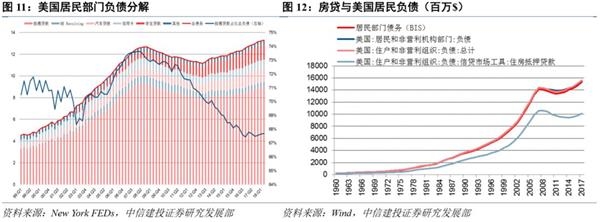 美国城镇化率变动对房地产销售、价格、景气预期都有一定的领先关系。而房地产销售与居民部门杠杆水平之间则有着明显的正相关,领先约两年。中国与美国居民债务受城镇化和房地产市场的影响,其相似点主要在于房贷占总债务一半以上,房地产市场走势和房贷直接影响居民部门的负债水平。