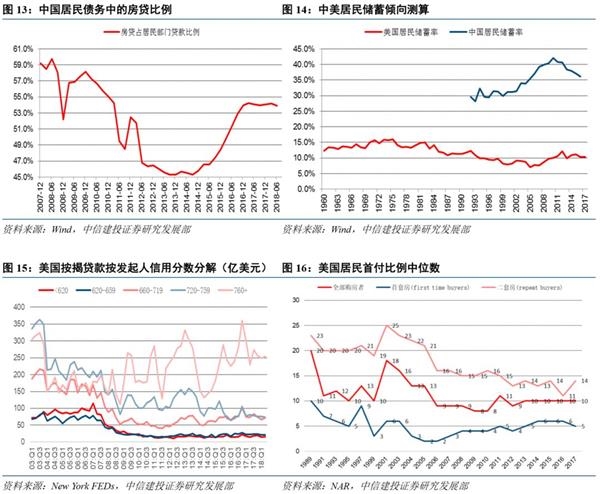 我国与美国居民债务受城镇化和房地产市场的影响,其相似点主要在于房贷占总债务一半以上,房地产市场走势和房贷直接影响居民部门的负债水平。不同之处主要包括(1)我国的城镇化增速显著较快,叠加人口基数大,住房需求增速较快。(2)我国居民相比于美国居民仍然有显著较高的储蓄率。(3)在首付比例、房价与收入比等方面有着诸多不同。(4)两国政府收入与房地产之间的关系不同,在美国这体现在对房产税的征收,一方面,美国每年征收约为房产价格1%的房产税。另一方面,房贷的利息可以参与抵减个人所得税,成为鼓励房贷的一项长期实行的优惠政策(我国在2018年10月20日由财政部和国家税务总局起草《个人所得税专项附加扣除暂行办法(征求意见稿)》中将房贷利息列入,对纳税人本人或配偶发生的首套住房贷款利息支出按每月1000元标准定额扣除)。在中国,政府收入与房地产之间的联系则主要表现为土地财政。