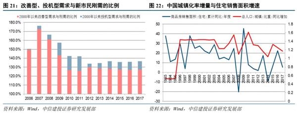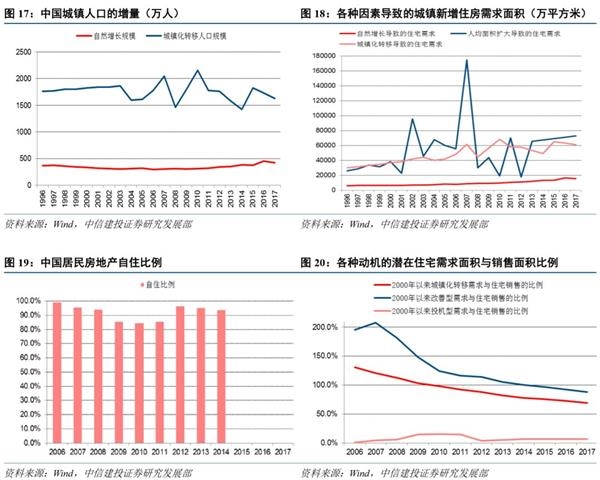 城镇化导致的增量住宅需求来自两个方面:城镇人口的自然增长和非城镇人口向城镇的转移。中国当前的城镇化进程主要由非城镇人口向城镇转移推动,我们的测算显示近二十多年来中国的城镇转移人口规模远大于城镇人口的自然增长规模。每年向城镇转移的新市民规模通常在1500万以上,而同期城镇人口的自然增长数量每年不超过500万,中国城镇化率的上升或主要由非城镇人口向城镇的转移所推动。结合城镇人均住宅面积数据,城镇的新增居住面积需求主要来自人口向城镇的转移和人均住宅面积的扩大,自然增长的影响相对较弱。与新市民的新增居住面积需求相比,人均住宅面积扩大导致的住房需求可能波动更有弹性。考虑到新增住房需求可能不会全部转化为当期购买,而是在未来的较长期间内逐步释放,我们测算了2000年以来的累计居住面积需求与住宅销售面积的比例。基于历史数据的测算显示,中国居民持有房地产的自住比例可能超过90%,假设该比例保持稳定,那么可以大致测算投机性需求的规模,并将人口自然增长和住房面积扩大的需求合并为改善型需求,将转移进城的新市民需求视为刚需。测算显示,2000-2017年新市民的刚需和改善型需求贡献了绝大部分的住宅销售量,改善型需求总量可能相比刚需更大。2000-2017年,城镇化新市民的住房需求可以贡献同期住宅销售的近七成,与改善型需求合计超过同期住宅销售面积的150%,叠加投机型需求的累计规模可能较小,历史城镇化人口转移所导致的住房需求可能尚未完全转化为购买力。本世纪以来,中国的住房销售面积增速与城镇化增量显著正相关,反映了城镇化人口转移对房地产市场的持续影响。