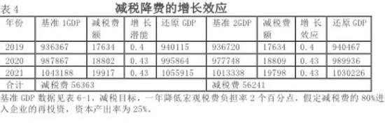 研究中,也对中国减税费的标准进行了划定,即不超过GDP的30%红线,据此计算了应当减少的税费规模。但是,一年减的力度太大,可能财政支出方面不能适应,于是形成了一个三年减税费的计划,并测算了其增加产出的成效。