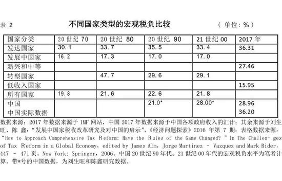 从表1看,中国作为一个发展中国家,2005年的宏观税负水平26.43%,其后每年负担平均增加1个百分点,2010年达到了36.22%。从表6-2可以看出,进入21世纪以来,发达国家的平衡宏观税负率降低到了33.4%,发展中国家的平均税负率只有17.0%,体制转型国家的税负率为29.1%,所有国家平均税率为21.8%。中国2017年宏观税负水平,分别比发展中国家和转型国家和平均水平高出19.2和7.1个百分点,与发达国家平均水平相当。