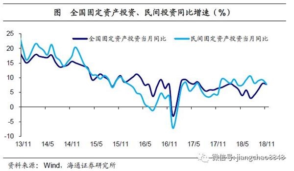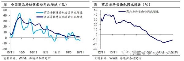 基建投资止跌企稳。1-11月新、旧口径下的基础设施投资累计同比增速分别为3.7%、0.9%,较1-10月一平一升。下半年以来,基建补短板政策发力,重大基础设施项目相继推出,基建投资增速也逐渐止跌企稳。展望19年,补短板发力有望继续带动基建投资增速反弹,但在地方隐性负债增长受限的背景下,回升幅度或较有限。