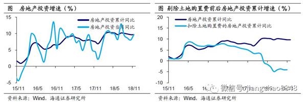 房地产投资小幅回落。1-11月房地产投资同比增速持平在9.7%,其中11月当月增速小幅反弹至9.7%。今年以来,房地产投资增速稳定在10%左右,主要归功于土地购置费高增长。1-10月土地购置费增速高达63.4%,剔除土地购置费后的房地产投资增速仅为-4.0%。而扣除价格因素后,1-9月房地产投资实际同比增速仅为4.1%,远低于名义增速9.9%,也印证今年以来地产投资高增与地价高企有关。展望19年,考虑到18年9月以来土地购置面积累计增速已持续下滑,土地购置费增速也将见顶回落,或导致19年地产投资增速明显下滑。