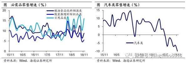 必需消费增速反弹仍偏低。分品类看,11月必需消费增速普遍反弹,反映“双十一”对必需消费提振效果显著。其中,食品、服装、日用品零售增速分别回升至8.8%、5.5%和16%,合计增速从10月的6.3%回升至8.5%,但依然偏低。