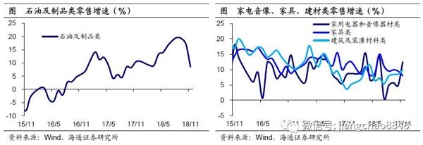 可选消费涨跌互现,汽车、石油拖累较大。11月可选消费增速涨跌互现。虽然地产相关的家电、家具、建材增速涨多跌少,但占比最高的汽车跌幅扩大至10%,占比次高的石油及制品增速腰斩至8.7%,成为消费增速下滑的主要拖累。