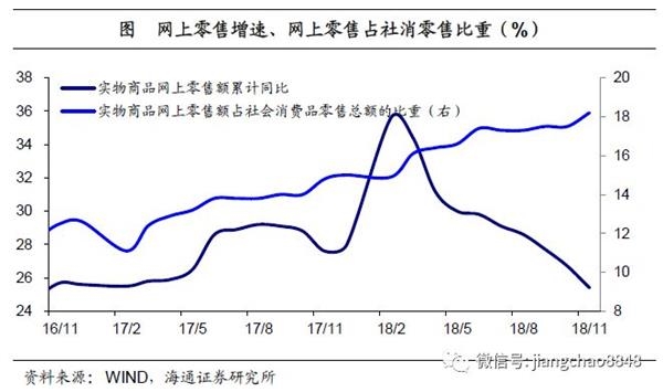 网上零售增速继续下滑,占比继续走高。1-11月实物商品网上零售同比增速继续回落至25.4%,已低于去年28%的年度增速,当月增速也已降至17.8%,但仍远高于社消零售增速,占社消零售额比重则继续上升至18.2%。