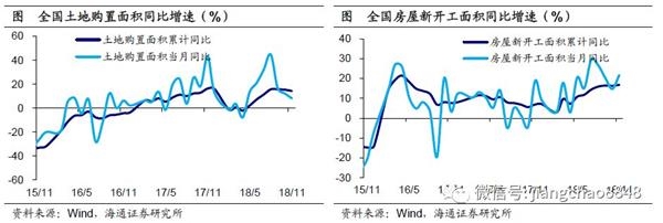 土地购置继续回落,新开工温和回升。地产销售低迷、库存去化放缓,令11月土地购置面积增速继续下滑,而新开工增速仍温和回升。展望19年,虽然新开工持续改善,但未来土地购置费增速见顶下滑,势必令地产投资承压。