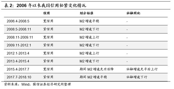 如何划分信用宽紧则略显模糊。由于社融这一指标衡量了金融体系对实体经济的资金支持程度,用社融增速趋势的变化能够较好的体现信用的宽紧。但需要注意的是,高频的社融同比增速数据起始于2015年(2015年之前只有季度数据,2016年央行开始披露月度数据)。因此在2015年之前,我们选择以M2增速来作为社融增速的替代项(M2的增量中的主体来自于银行表内信用投放的派生),2015年之后则采用社融增速,以此判断信用是否宽松。下表反映了2006年以来我国信用松紧的变化情况。