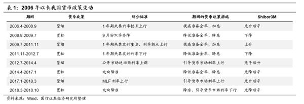 划分货币政策宽紧的逻辑较为简单。货币当局的货币政策工具操作是判断货币松紧的关键点,政策当局首先根据当时经济环境做出判断(“先说”),之后再出台落地实际的政策(“后做”)。通过实际观察,政策真正落地实施更能够反映货币政策的松紧程度。通过对货币政策工具(准备金率、基准利率,以及央票、逆、MLF等政策性利率)拐点的判断,能够辨明货币政策的松紧。表1列举了2006年以来我国货币政策的变动情况,从历史变动情况来看,利率与货币松紧有较为明显的相关性,紧货币往往对应利率上升,宽货币则往往对应利率下降。